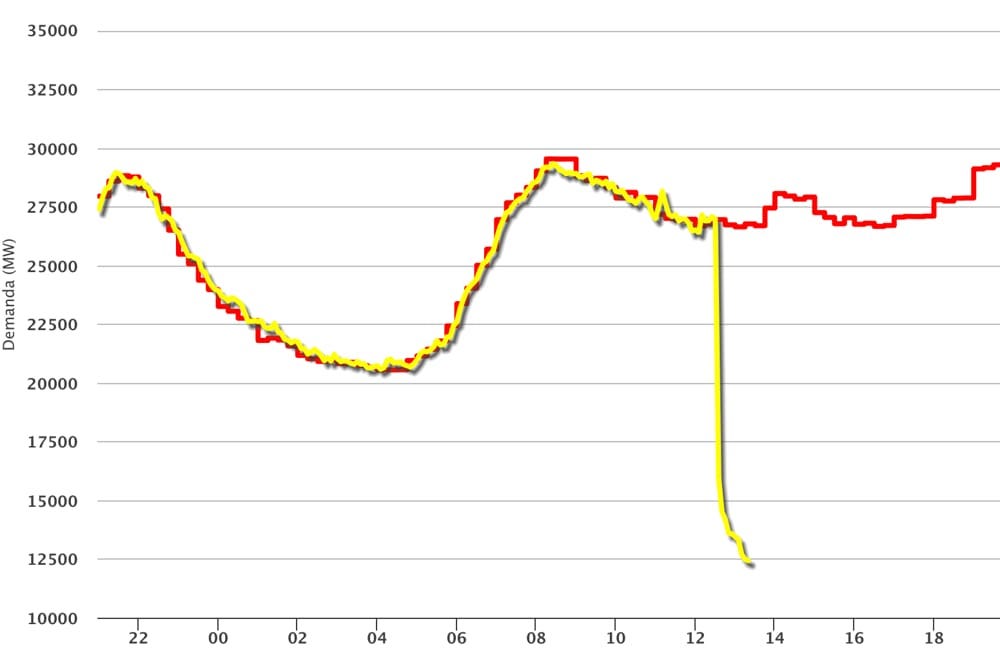 Domanda di energia elettrica (MW) della rete spagnola il 28 aprile 2025: la linea rossa indica la curva di domanda prevista, quella gialla la domanda reale. Al picco del blackout (intorno alle 12:35) si vede il crollo improvviso di decine di GW (linea gialla) dovuto alla perdita di generazione.
