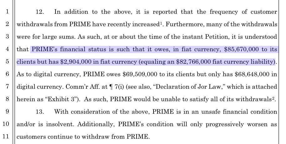 Dalle carte emergono numeri preoccupanti: Prime Trust deve ai propri clienti $85.670.000 in valuta fiat, ma ha la disponibilità di soli $2,904,000. Com’è possibile che un’azienda di sola custodia di denaro - quindi non coinvolta in pratiche come la riserva frazionaria - si ritrovi improvvisamente con oltre $80 milioni gestiti in meno rispetto a quelli versati dai clienti? In particolare, a un solo anno di distanza dal round di investimenti in cui aveva raccolto ben $100 milioni.