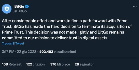 Ebbene, il 22 giugno, il giorno successivo all’ordine di cease and desist, BitGo ha annunciato su Twitter l’annullamento dell’acquisizione di Prime Trust. Nulla è ancora confermato da fonti ufficiali, ma il sospetto che la due diligence non sia andata secondo le aspettative è forte.
