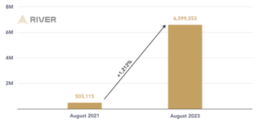 Gran parte del report di River mette a confronto lo stato della rete ad agosto 2023 con quello ad agosto 2021. Nei due anni presi in considerazione il volume di ricerca su Google per il termine “Bitcoin” è diminuito del 45% e il prezzo è calato del 44%. L’interesse, quindi, è andato scemando. Nonostante ciò, la crescita è stata vertiginosa.