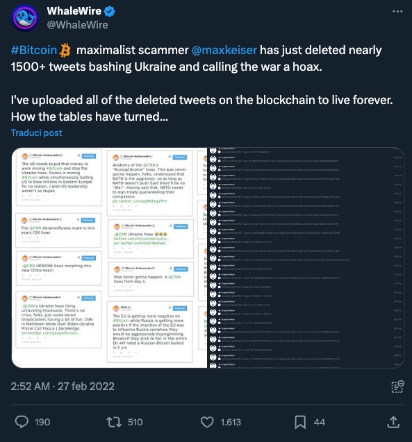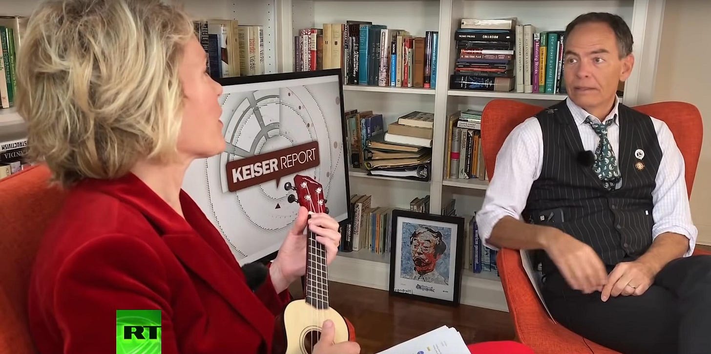 La coppia ha messo fine a Keiser Report nel febbraio 2022, rassegnando le dimissioni da Russia Today dopo l’invasione dell’Ucraina da parte del Cremlino. Come riportato dal popolare account WhaleWire su Twitter, Keiser per l’occasione ha eliminato oltre 1.500 tweet relativi alla guerra, in alcuni dei quali definiva il conflitto una “bufala”.