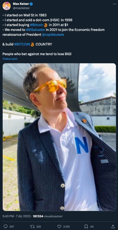 A scriverlo su Twitter, lo scorso 6 dicembre, è Max Keiser, senior advisor del presidente di El Salvador Nayib Bukele. L’affermazione arriva in un momento in cui è acceso il dibattito su Ordinals, Inscription e, più in generale, transazioni che includono dati arbitrari sulla blockchain di Bitcoin, aumentando il costo delle commissioni. Ma, al di là dell’oggetto della discussione, il protagonista di questa puntata è l’autore del tweet.