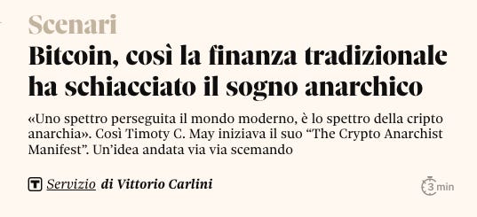 Per accedere alla completa versione narrata dell’articolo ed entrare nel gruppo Telegram dedicato alla newsletter, abbonati a Bitcoin Train. Puoi farlo sia pagando in bitcoin (clicca qui) che in euro (clicca qui).