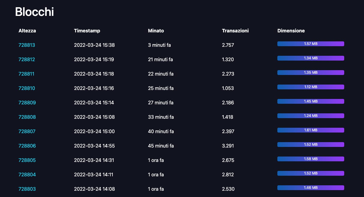 Una transazione in bitcoin è puro testo. Quando si effettua un pagamento non si fa altro che ordinare a un software di scrivere codice che, compatibilmente con il protocollo Bitcoin, comunichi al resto della rete che il soggetto A sta inviando un determinato importo al soggetto B. I testi contenenti le varie transazioni vengono raggruppati in pacchetti di dati (e quindi di byte) che, insieme ad altre informazioni, formano i blocchi della blockchain, la cui dimensione massima non supera i 4 MB2: questo fa sì che all’interno di un blocco si possa inserire solamente una quantità di testo (byte) limitata. Quando le transazioni sono troppe, alcune vengono escluse dal blocco, restano in un limbo chiamato mempool e aspettano di essere incluse nei blocchi successivi3.