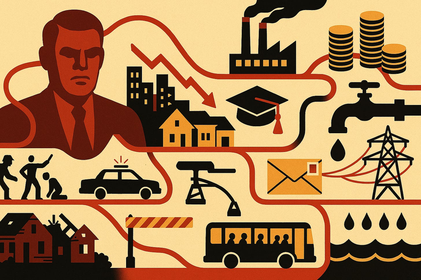 In sintesi. Se guardiamo ai problemi cruciali della nostra società – le aree di crisi e fallimento – troviamo in ciascuna di esse un “filo rosso” che le unisce tutte: il filo del governo. In ogni caso, il governo ha gestito o influenzato pesantemente l’attività.