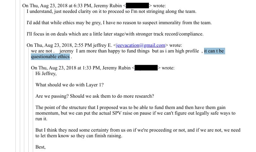 Forse il dettaglio più grottesco emerge da uno scambio di email con Jeremy Rubin, sviluppatore Bitcoin e co-fondatore della Digital Currency Initiative dell’MIT. Nel 2018, Rubin propose a Epstein alcune opportunità di investimento legate alle criptovalute, inclusa una potenziale partecipazione in Layer 1, una società di mining.
