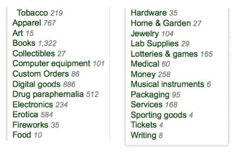 Non ci volle molto perché il sito, spinto dal suo successo economico, venisse etichettato dai mass media come l’Amazon della droga. Sebbene sia difficile ottenere dati affidabili su quali fossero effettivamente i beni venduti su Silk Road e in quale quantità - per il fatto che il sito girava su rete onion sfruttando Tor - un paio di fonti rendono l’idea.