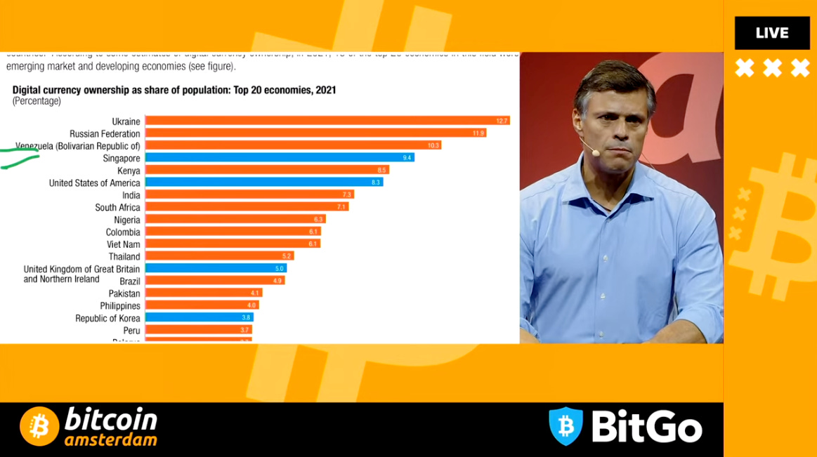 Secondo i dati mostrati durante l’intervento, nel 2021 il 10,3% della popolazione venezuelana deteneva criptovalute.