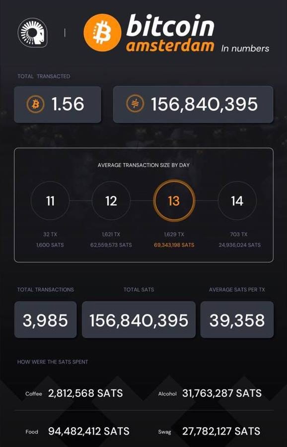Diversamente da Riga, alla Bitcoin Amsterdam era possibile acquistare qualunque cosa in bitcoin - cibo, bevande, alcolici, gadget - tramite LN. Ai commercianti presenti è stato fornito il wallet Lightning di Ibex - payment sponsor della conferenza - permettendo a tutti di scegliere se pagare in euro o in sats. Molti partecipanti utilizzavano Zeus, uno dei wallet più diffusi per collegare lo smartphone al proprio nodo Lightning, altri Blue Wallet, Muun Wallet, Wallet of Satoshi, Phoenix. Il risultato è che nei tre giorni di conferenza le compravendite in sats hanno raggiunto il valore complessivo di 1,56 bitcoin (o 156,8 milioni di satoshi) con quasi 4.000 transazioni.