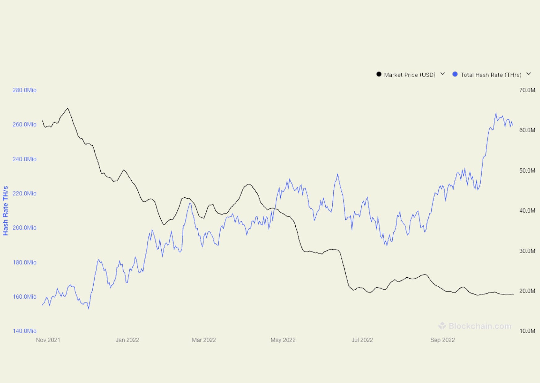 L’hash rate1- l’unità di misura che indica la capacità computazionale della rete - è in sostanziale ascesa. Quando il prezzo ha toccato i $20.200 il 24 giugno, l’hash rate era di 206 EH/s. Il 25 ottobre, con bitcoin a $19.300, è arrivato a 259 EH/s: una crescita del 26%. Questo andamento in controtendenza va avanti in realtà da molto prima: già a novembre 2021, quando il prezzo di bitcoin ha iniziato il suo crollo dai $67.000, la potenza computazionale del network aumentava come se nulla fosse.