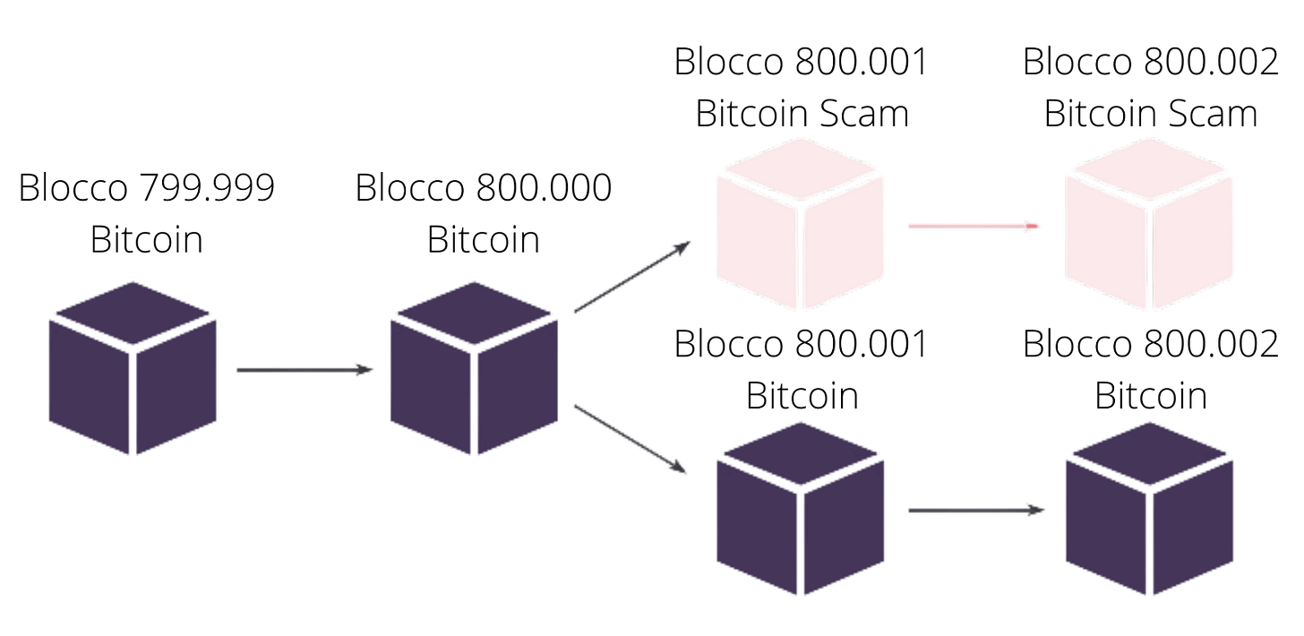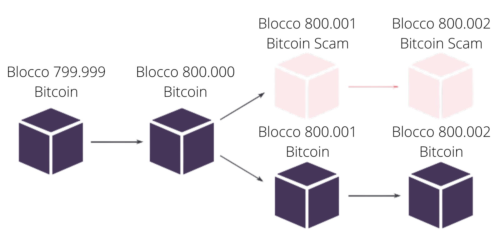 Supponiamo che io voglia aumentare la dimensione dei blocchi di Bitcoin a 10 MB e che questa idea abbia ottenuto un buon consenso tra i partecipanti della rete. Sviluppo il software che implementa questa modifica - chiamiamolo Bitcoin Scam - e ne pubblico il codice, dicendo che a partire dal blocco numero 800.000 potrà essere utilizzato da chiunque. I nodi di mining che sono d’accordo con me al blocco 800.000 inizieranno a costruire un blocco, l’800.001, non compatibile con le regole di protocollo del codice Bitcoin originale ma compatibile con le nuove regole di Bitcoin scam.