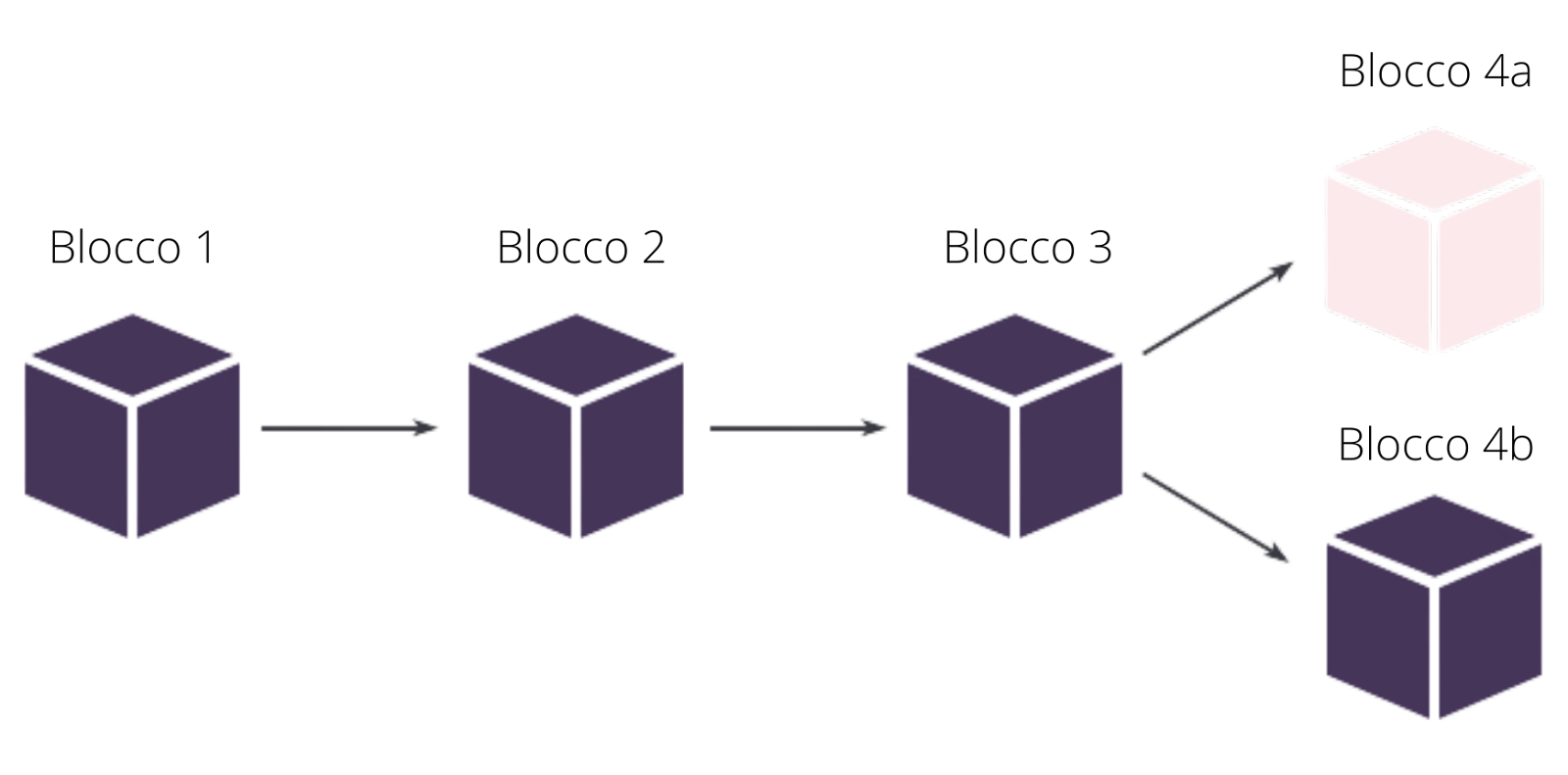 Supponiamo di trovarci all’altezza del blocco numero 3. Quando un miner trova una soluzione alla Proof-of-Work e inoltra il blocco successivo ai propri peer, questi lo ricevono prima di altri nodi. Nello stesso momento un altro miner trova anch’esso una soluzione valida alla Proof-of-Work e invia il suo blocco ai propri peer. In questa situazione nella rete si propagano due blocchi diversi, potenzialmente entrambi validi. Alcuni nodi - quelli più vicini al nodo del primo miner - ricevono prima il blocco che chiamiamo 4a, altri - quelli più vicini al nodo del secondo miner - ricevono prima il blocco 4b.