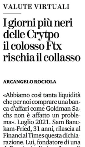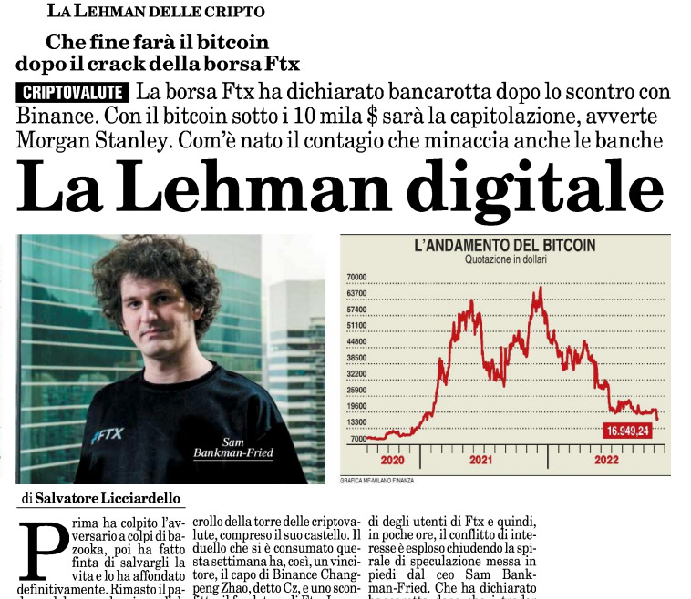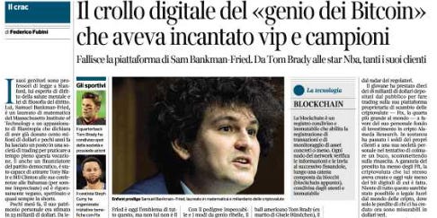 Lo scorso 12 novembre, a pagina 21 dell’edizione cartacea del Corriere della Sera, compare un articolo dal titolo: “Il crollo digitale del «genio dei Bitcoin» che aveva incantato vip e campioni”.