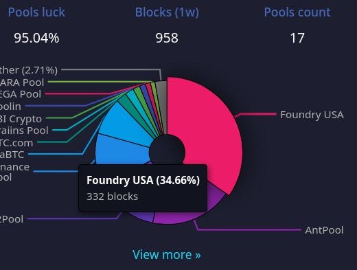 Se un tale scenario potrebbe poi non essere così lontano dalla realtà che ci attende, oggi siamo ancora nel capitolo genesi di Bitcoin, per cui le cose stanno molto diversamente. Il mining si sta centralizzando. La sola pool Foundry USA coordina il 34% dell’hash rate1. Se si aggiunge AntPool, la cui quota è del 17%, si arriva già al 51% della potenza computazionale globale di Bitcoin: in mano a due sole pool. A sottolineare il problema è stato recentemente anche il noto sviluppatore Peter Todd, che su Twitter ha scritto: “Abbiamo davvero bisogno che i miner si spostino da Foundry a pool più piccole”.