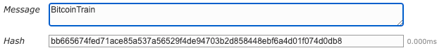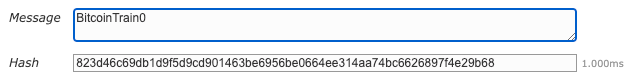 Dando in pasto il nome “BitcoinTrain” all’algoritmo SHA-256, il risultato è bb665674fed71ace85a537a56529f4de94703b2d858448ebf6a4d01f074d0db8.