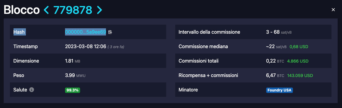 I minatori che hanno partecipato alla gara per minare il blocco successivo, hanno quindi dovuto includere nell’intestazione del blocco 779879 l’hash sopra indicato.