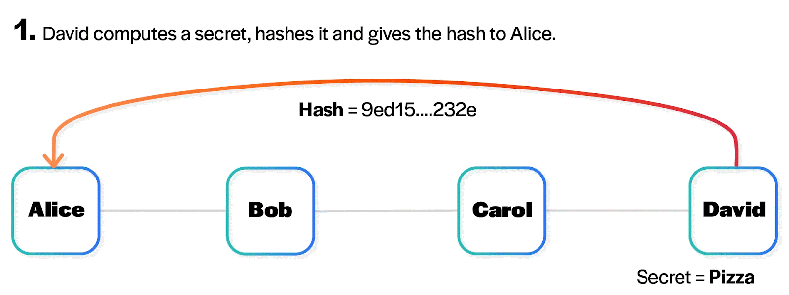 Per prima cosa David, il destinatario del pagamento, crea da un generatore di numeri casuali un valore chiamato Payment Secret, calcolandone poi l’hash SHA-2561. Il risultato prende il nome di Payment Hash e viene inviato da David ad Alice, la mittente della transazione.