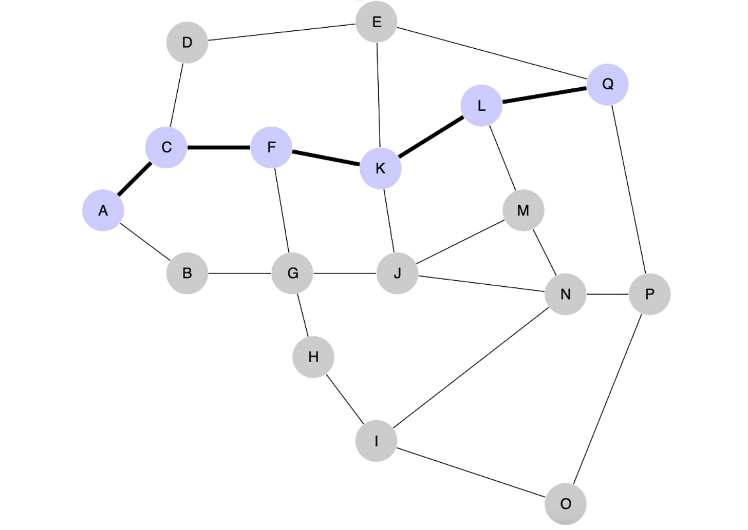 Nell’illustrazione il nodo A vuole pagare il nodo Q, con cui però non ha un canale diretto. Tuttavia è connesso con il nodo C, il quale ha un canale con il nodo F, che ne ha uno con il nodo K, che ne ha uno con il nodo L, che ne ha uno con il nodo Q.