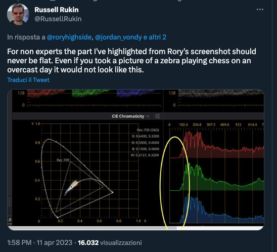 Per sua sfortuna molti bitcoiner sono abituati a verificare e non fidarsi. Un utente ha mostrato l’analisi spettrografica del video, evidenziando come una parte dei colori sia artificialmente piatta, a livello zero: fattore non naturale che evidenzia una selezione molto accurata dei profili colore. Al punto che un altro utente commenta: “Per i non esperti, ho evidenziato la parte che non dovrebbe essere mai piatta. Anche se faceste una foto a una zebra che gioca scacchi in una giornata nuvolosa, il grafico non sarebbe così”.