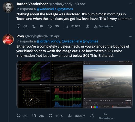 Qualcuno su Twitter si è preso il disturbo di chiedere all’autore del video se il lavoro fosse stato modificato in fase di post-produzione per far apparire l’ambiente più inquinato. Il videomaker ha quindi risposto che non c’è stata alcuna modifica ma che in Texas “è umido quasi tutte le mattine e quando il Sole sorge arriva la foschia anche a basse altitudini”.