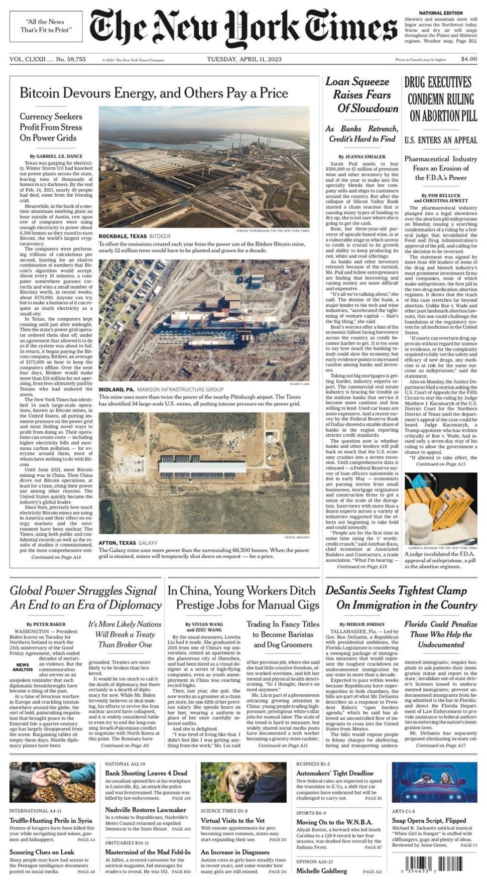 La visibilità che viene data all’articolo è sorprendete: la prima pagina del Times è dominata dal reportage con un titolo che non lascia spazio a interpretazioni: Bitcoin divora energia e gli altri pagano un prezzo. I miner approfittano dei momenti di stress delle reti elettriche.