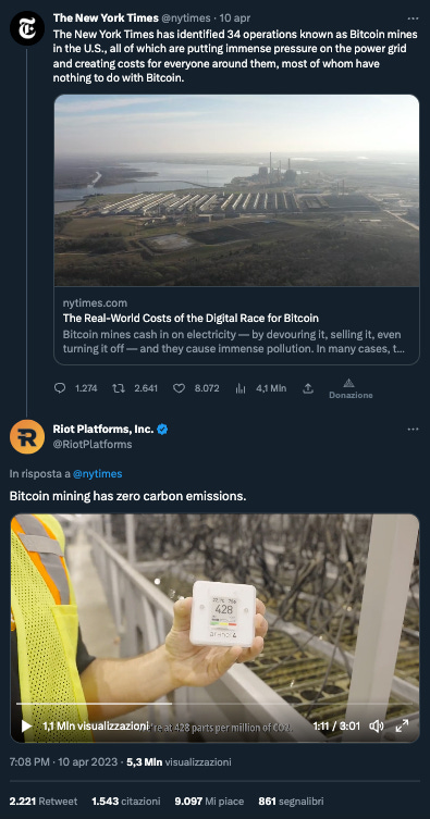Proprio Riot Platforms, dopo l’uscita dell’articolo del Times, ha pubblicato un comunicato stampa in risposta al reportage intitolato: L’attacco politico del New York Times al mining di Bitcoin è pieno di distorsioni e di vere e proprie falsità.