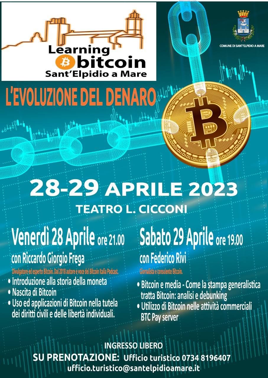 Venerdì 28 e sabato 29 aprile, al teatro Cicconi di Sant’Elpidio a Mare (FM), si terrà l’evento Learning Bitcoin, l’evoluzione del denaro. Due serate dedicate alla scoperta e all’approfondimento della scoperta di Satoshi Nakamoto.