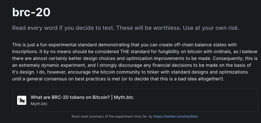 A inizio marzo uno sviluppatore conosciuto su Twitter con lo pseudonimo Domo ha pubblicato il protocollo “BRC-20” definendolo un “divertente standard” per “sperimentare la fungibilità dei token su Bitcoin tramite la teoria degli Ordinals”. Sotto al titolo BRC-20 ha consigliato agli interessati di “leggere ogni parola” prima di “fare un test” perché "questi token saranno inutili” e vanno utilizzati a “proprio rischio e pericolo”.