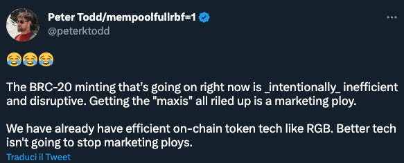 Lo sviluppatore Peter Todd ha sostenuto su Twitter che la generazione di nuovi token BRC-20 sia “intenzionalmente inefficiente” per far innervosire i massimalisti.