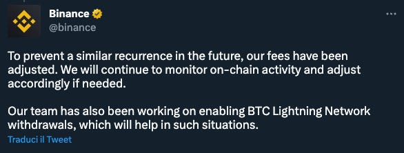 Insomma, l’estensivo uso di Ordinals, inscription e token BRC-20 si è rivelato, come sembrava fin dall’inizio ai più scettici, un attacco mirato a Bitcoin per promuovere qualche alternativa truffaldina. L’esito, tuttavia, non è stato dei migliori per gli attori malevoli: l’innalzamento delle commissioni ha fatto accorgere alcuni grandi player dell’opportunità di implementare il Lightning Network. Il più grande exchange al mondo, Binance, lo ha annunciato l’8 maggio dopo essersi visto costretto a mettere in pausa i prelievi per il prezzo delle transazioni.