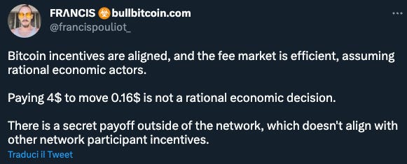Se da un lato è vero che questo è il futuro che attende Bitcoin - pagamenti di piccola e media entità che verranno eseguiti in gran parte sul Lightning Network, con solo grandi transazioni di settlement sulla timechain - dall’altro è anche vero che a quella fase non siamo ancora arrivati. Lightning è utilizzato molto poco ed è in continuo sviluppo. Ci troviamo a tutti gli effetti in un lungo periodo di transizione. Vedere commissioni così alte per transazioni classiche, quindi, dà fastidio a tanti.