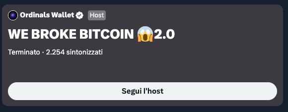Forse perché un mancato innalzamento dei prezzi delle transazioni non genererebbe un dibattito sufficientemente animato e la visibilità di soggetti come Udi Wertheimer ed Eric Wall, da sempre interessati a promuovere altcoin per il bene delle proprie tasche e leader indiscussi tra i fan degli Ordinals, non ne gioverebbe abbastanza. Di certo non li porterebbe a partecipare a Twitter Space organizzati dai gestori del wallet Ordinals, il più utilizzato per le inscription, in cui viene persino avanzata la provocazione di aver “rotto Bitcoin”.