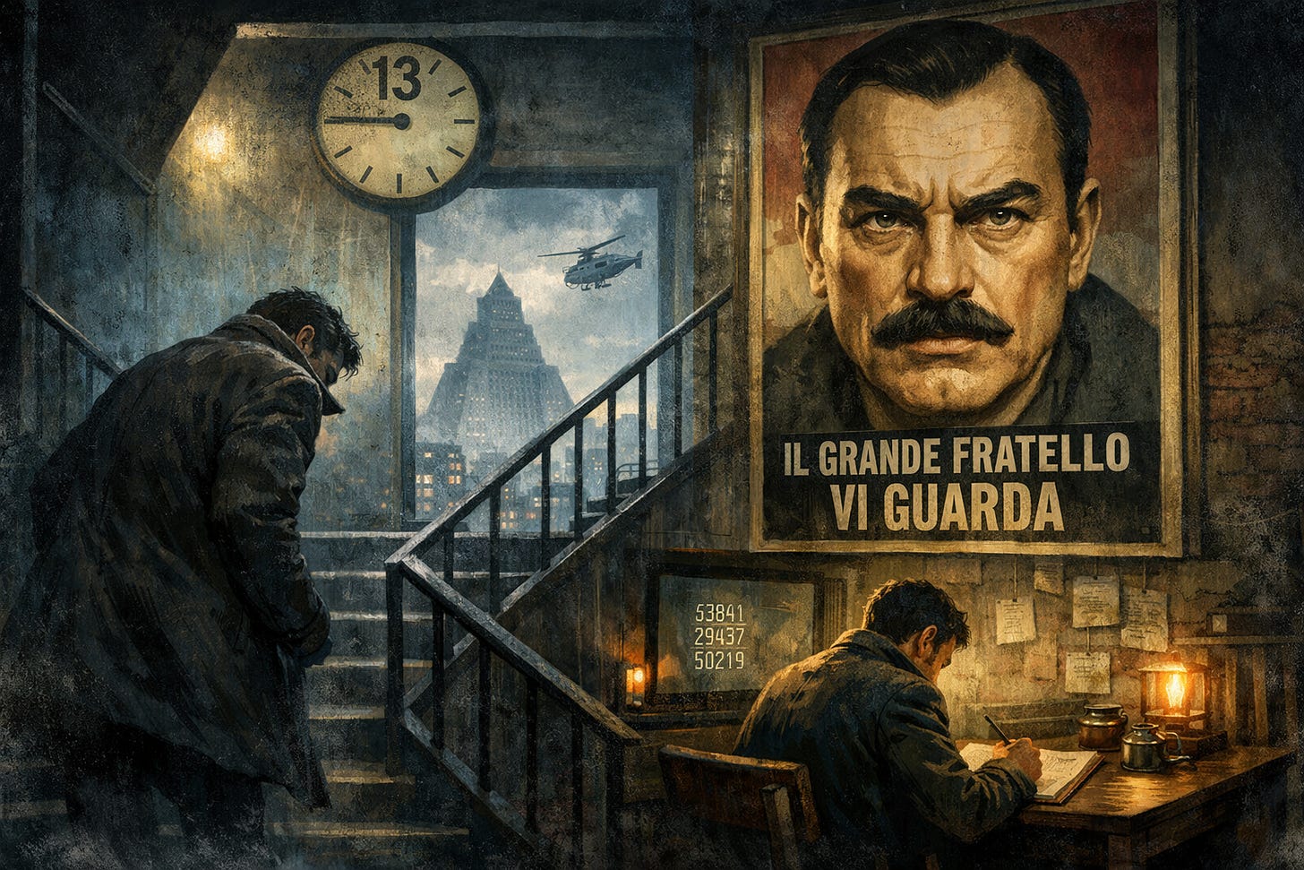 Il mondo distopico per eccellenza, descritto nell'incipit di uno dei libri più iconici dell'ultimo secolo. George Orwell dipinge le tinte grigie dello sfondo in cui è ambientato 1984